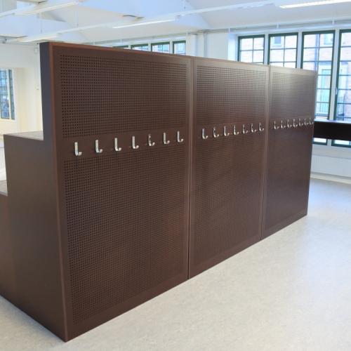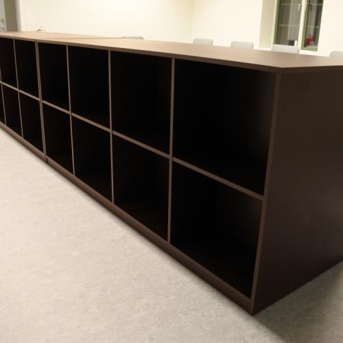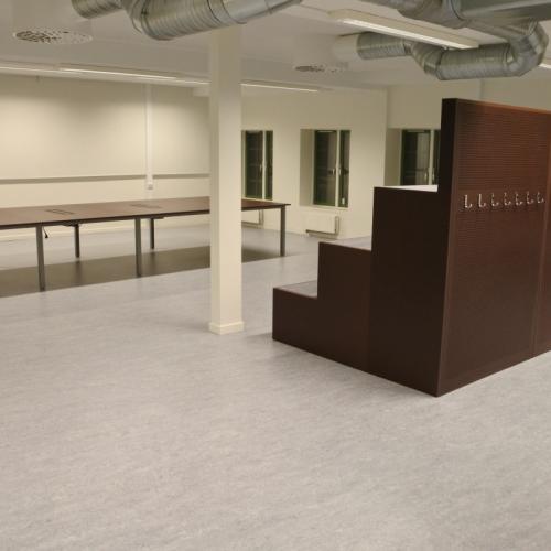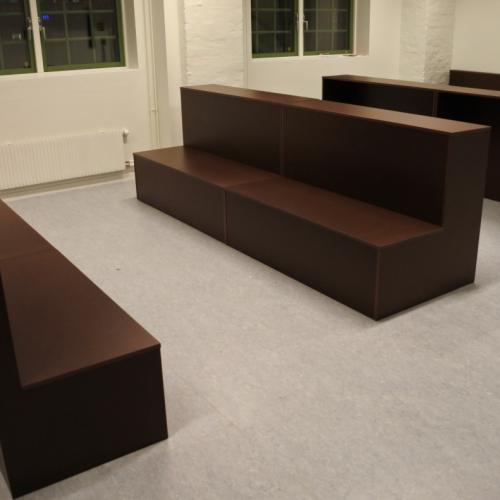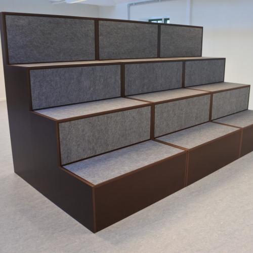 Katedralskolan i Linköping valde möbler ur Sjöstan-serien. Specialdesignade av ansvarig arkitekt hos Arkitema Architects. Chokladbrun genomfärgad MDF i kombination med grå filt gör läktarmöbeln tålig och snygg. Skolan fick också stora bord för samarbete, bord i ståhöjd, bokhyllor och sittbänkar för kapprum etc.