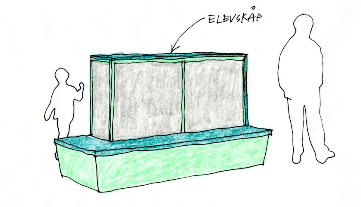 Möbeln består av elevskåp med en fast sittbänk på två sidor. Den unika konstruktionen reducerar oönskat ljud och buller.